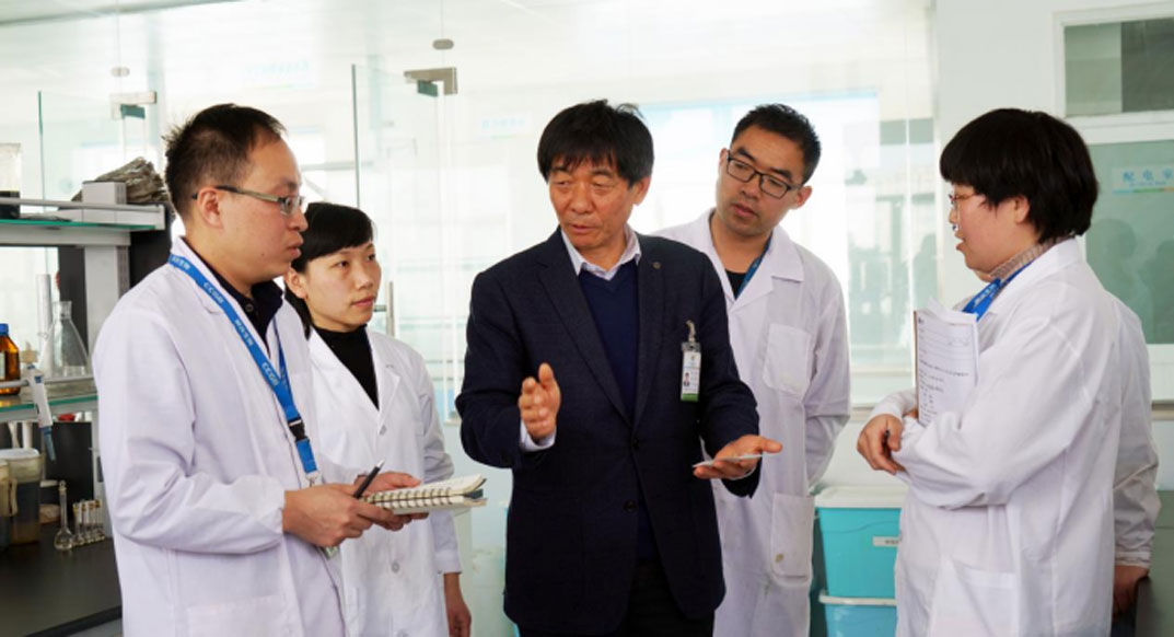 圖為集團公司董事長兼總經(jīng)理盧慶國在和研發(fā)人員探討創(chuàng)新思路